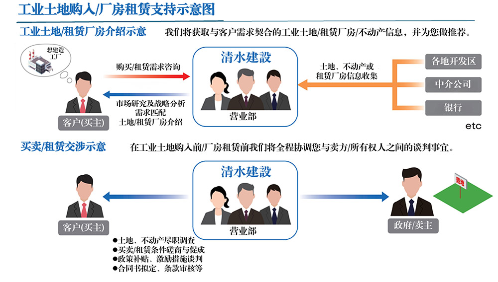 清水建设联合专业团队打造全维度选址体系,依托中国市场数据库与土地厂房资源网络,快速锁定潜在合适的项目地,协助争取投资优惠、税收减免等政策支持,并全程提供尽职调查、合同谈判、审批对接服务,确保项目高效推进,加速工厂建设落地。