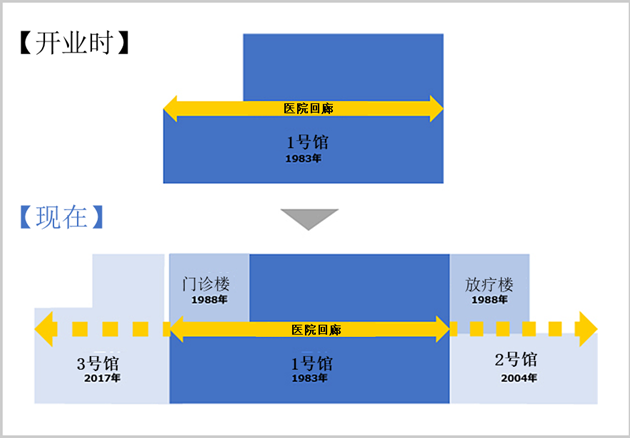 医院场地从东至西有300m,形状细长。最初建造的1号馆位于场地中央,然后按照总体规划,2004年在东侧增建了2号馆,2017年在西侧增建了3号馆。如今,该院已成长为拥有785个床位的高度急性病医院。