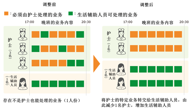 对此,清水调查了护士与生活辅助人员的业务内容及所耗时间,然后进行清晰明了的“可视化”。由此发现,护士承担的部分业务可分配给生活辅助人员。于是在征得相关人员同意的基础上,调整了业务分工,合理进行了人员配置。这样,护士直接护理的时间就增加了。