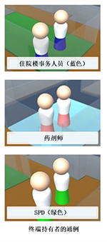 首先,我们在医院施设安装了ICT设备(Beacon),调查了员工在实际业务中的移动轨迹,然后在3D平面图上进行了“可视化”。接着以此为基础,与医院员工交流,改善了规划方案(靠近移动频率较多的房间等),并评估了动线,同时对业务改善提出建议,例如变更向住院楼送药的员工职务种类等。