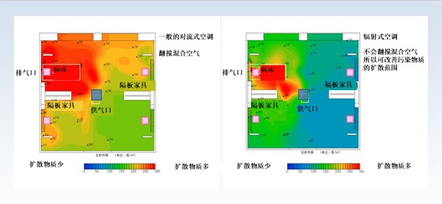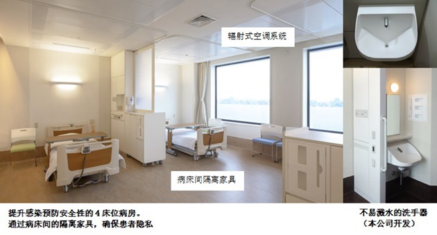 对于将空气中异味及污染物质扩散降低到最低限度的空调及通风系统,以及防止飞沫感染的病床间隔离家具等,通过这些方式的组合,做到让气流单方向流动,从而打造出降低空气感染风险的环境。并且为方便护士保护手指卫生,还开发出水不易溅出的洗手器。