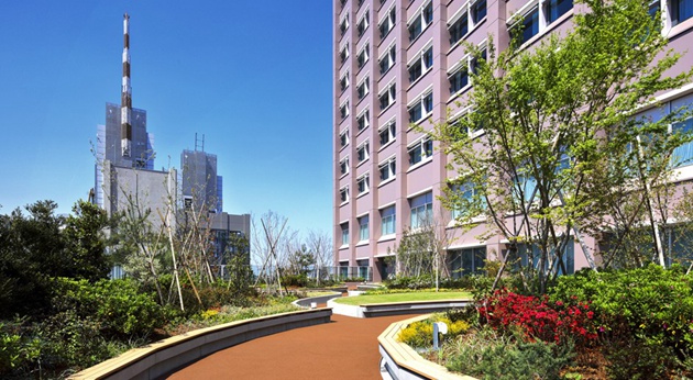 高楼层部分的所有病房都可眺望美丽的景色。中楼层的屋顶庭园可舒缓院内患者及家属心情。