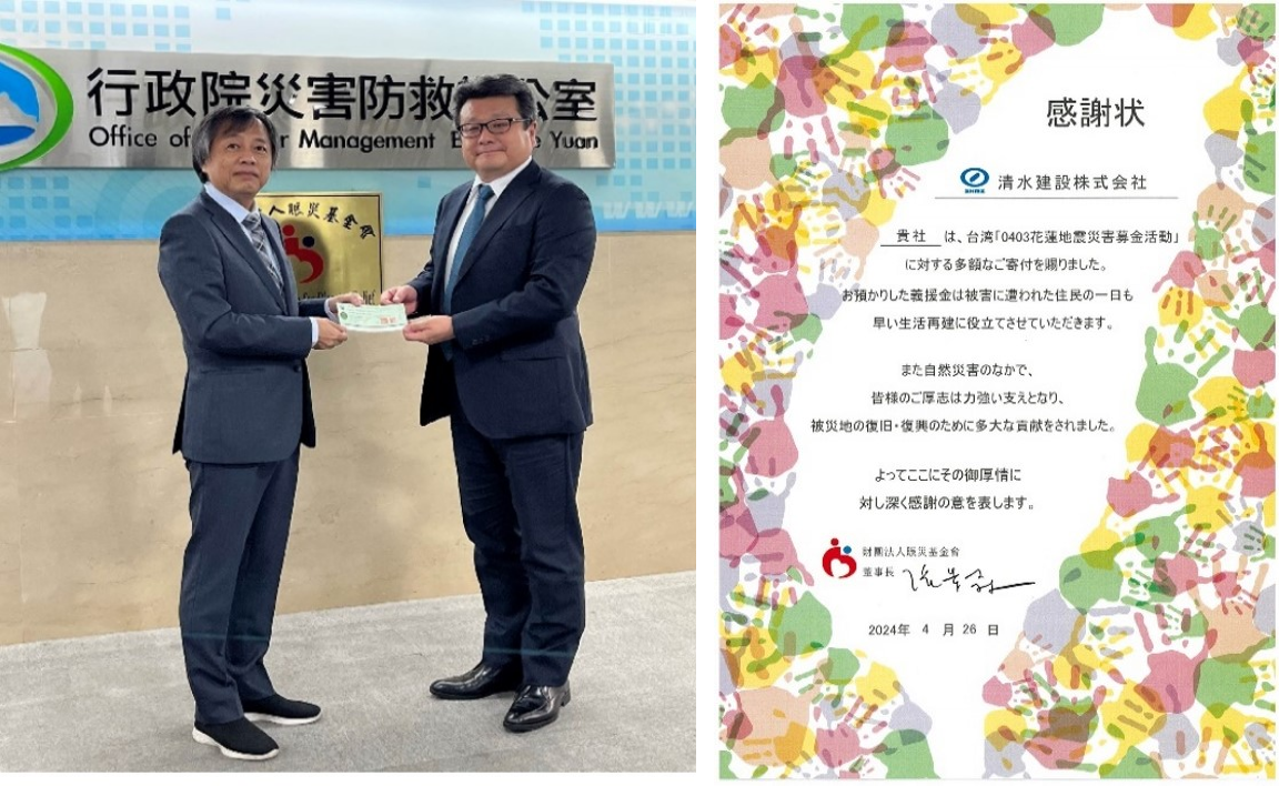 2024年4月3號,台灣花蓮外海發生了嚴重的大地震,造成許多房屋、道路損毀及民眾的生活不便。清水建設秉持關懷社會的人道精神,貢獻一己之力,希望能幫助受災民眾早日回復到日常生活。