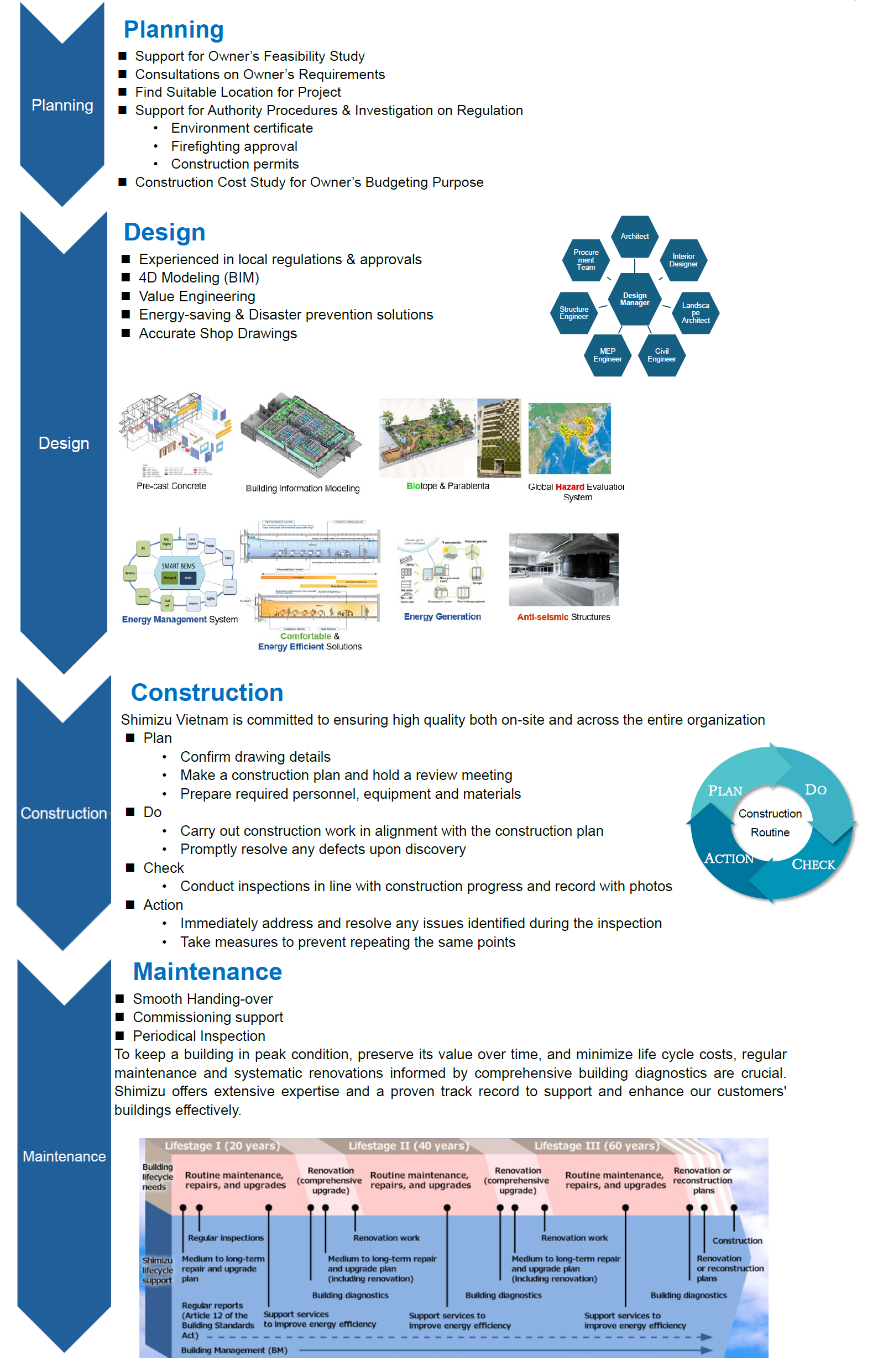 As your LIFETIME PARTNER, we fully commit to providing comprehensive support for your project at every phase and stage. Our team of specialists, based at our Tokyo headquarters and across our global network, is dedicated to ensuring the success of your important facilities.